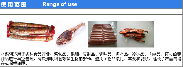 该机适 用如:肉类加工、酱腌产品、水产、海产品加工、蔬菜加工、农副产品加工、果脯、粮食、豆制品、药材、电器、化学制品等颗粒、粉状、液体等食品进行真空后充惰性气体包装、可以防止产品氧化霉变、腐败、防潮达到延长产品的储存期限。
